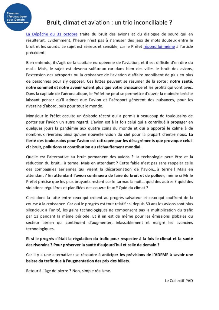 Bruit, climat et aviation : un trio inconciliable ? juin 24, 2025octobre 1, 2022 par Minh DRAPO Le Collectif Pensons l’Aéronautique pour Demain (PAD) réagit aux propos du préfet de région Occitanie, Monsieur Etienne Guyot. Partager sur FacebookPartager sur X