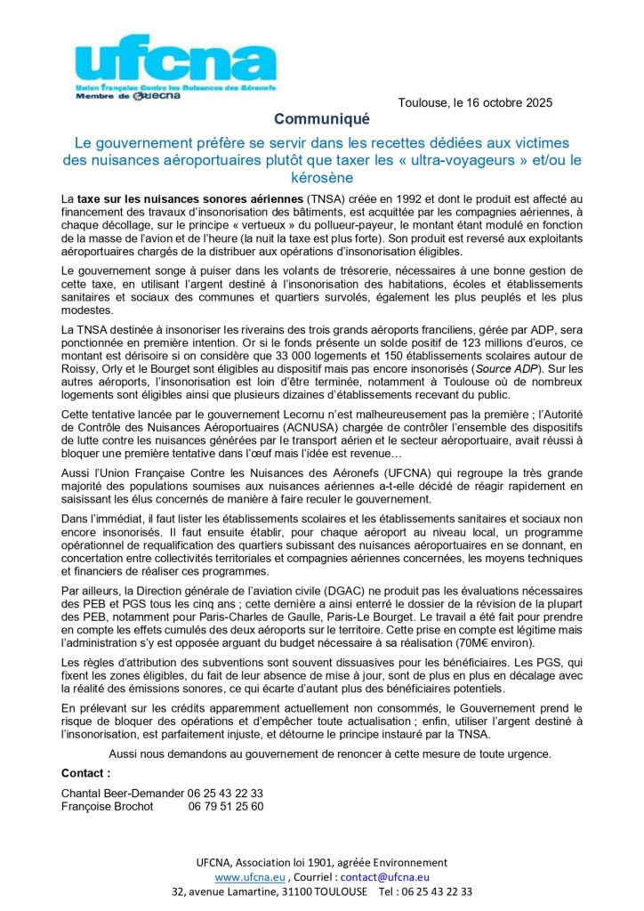 Le gouvernement préfère se servir dans les recettes dédiées aux victimes des nuisances aéroportuaires plutôt que taxer les « ultra-voyageurs » et/ou le kérosène décembre 24, 2025octobre 16, 2025 par Chantal Beer-Demander Partager sur FacebookPartager sur X