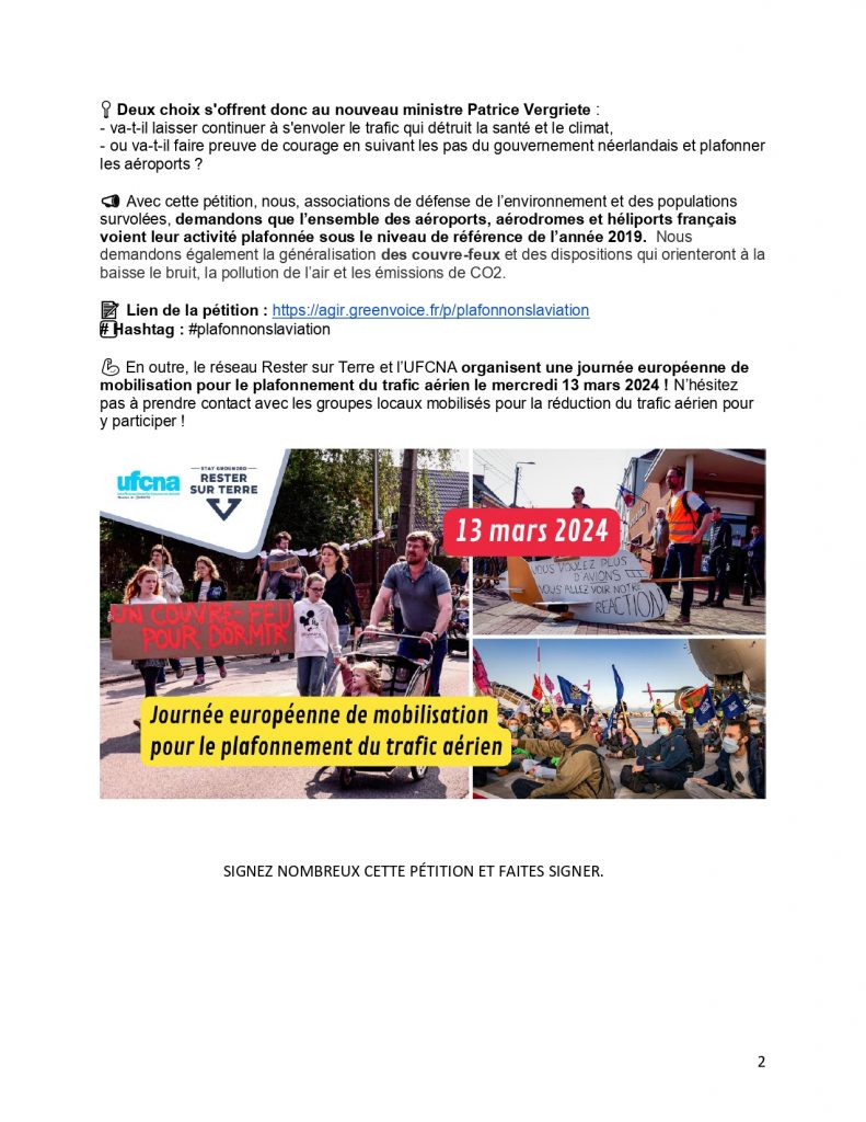 Avec cette pétition, nous, associations de défense de l’environnement et des populations survolées, demandons que l’ensemble des aéroports, aérodromes et héliports français voient leur activité plafonnée sous le niveau de référence de l’année 2019. Nous demandons également la généralisation des couvre-feux et des dispositions qui orienteront à la baisse le bruit, la pollution de l’air et les émissions de CO2.